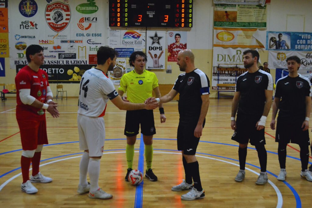 Neanche il tempo di fischiare l’inizio del secondo tempo e Pestrichella, prima semina il panico sull’out di sinistra, poi serve a Lorusso Pasquale l’assist del 4-0. Pestrichella assoluto protagonista anche al settimo: ruba palla ad un avversario, si invola sulla fascia destra e serve Santacroce al centro, che insacca il gol del 5-0. Al 12’ Santacroce colpisce il legno, ma sulla ribattuta arriva Forte, che ribadisce in rete il 6-0. La settima rete altamurana nasce da un’ invenzione di Forte: pallonetto preciso per Santacroce, che aggancia a pochi passi da Rizzi e lo batte con un destro forte e preciso. Una distrazione difensiva costa il gol degli ospiti, che arriva con Romagno al 19’ dopo una bella parata di Vitale su tiro di Spinelli. Vitale si spinge oltre la linea di centrocampo, cede la palla a Maiullari, filtrante per capitan Gramegna, che manda all’incrocio dei pali la palla del 8-1. A due minuti dalla fine, Pestrichella, ombre del partido senza alcun dubbio, serve il suo quarto assist di giornata a Gramegna Felice, che realizza la rete del definitivo 9-1.